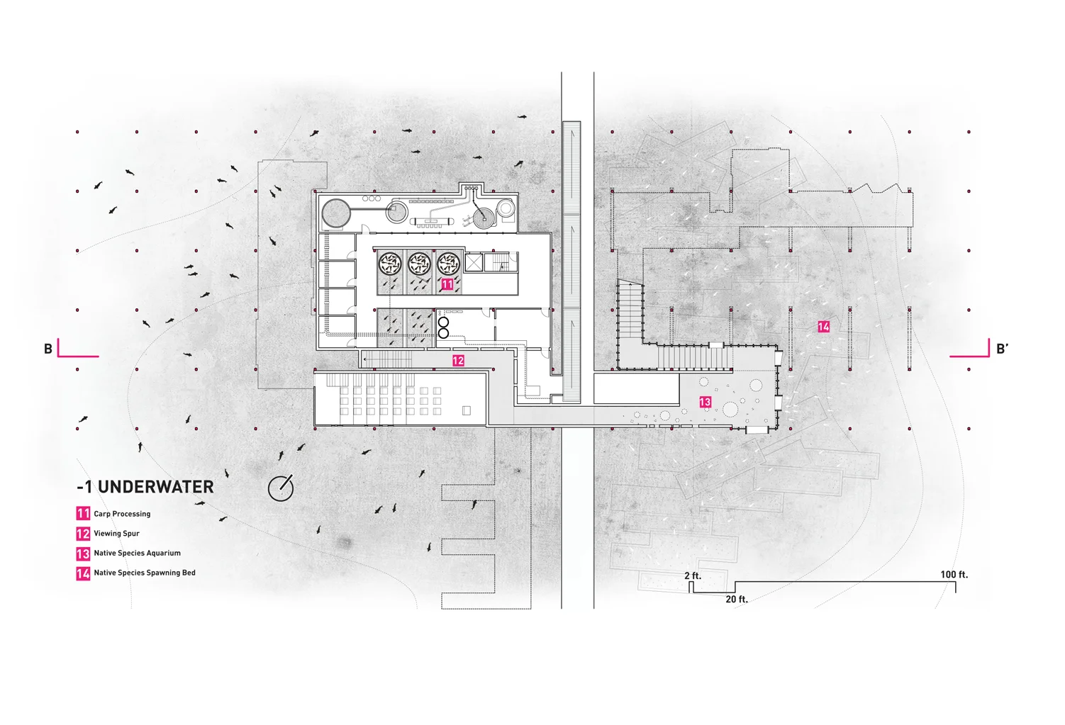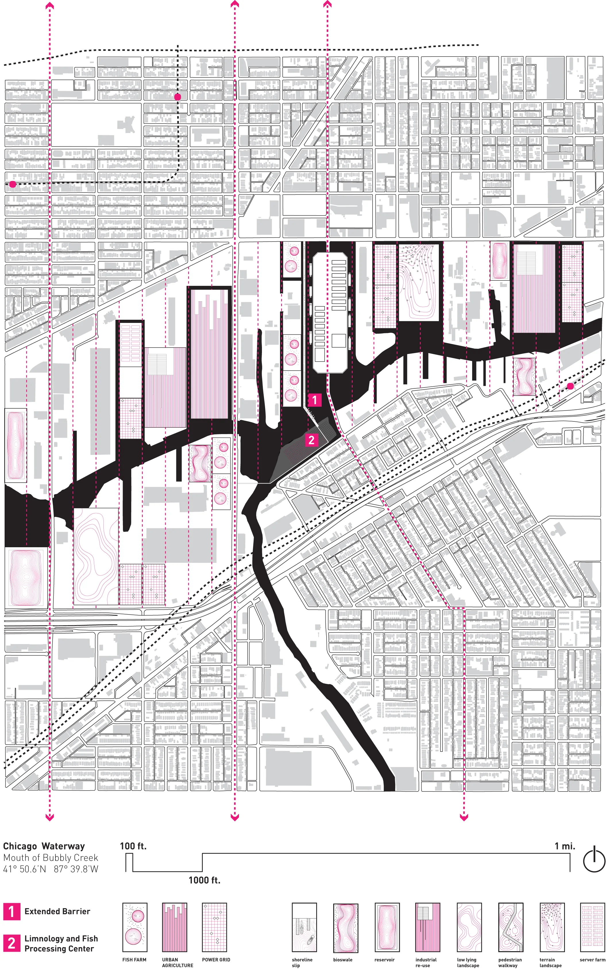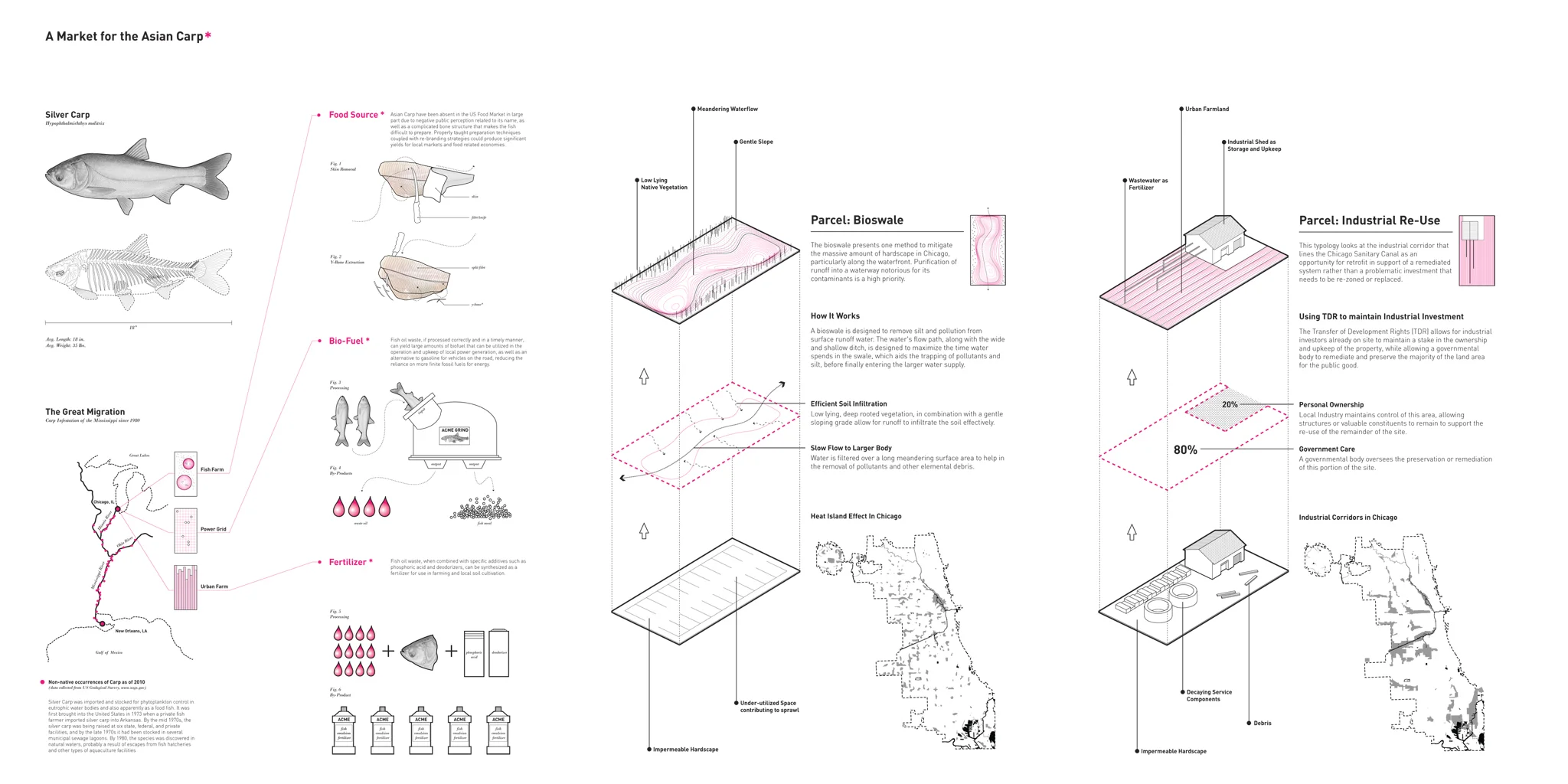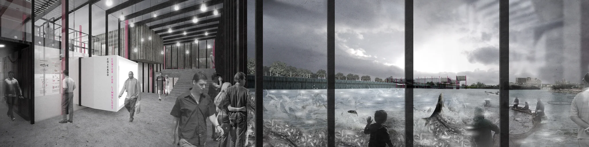 This project attempts to utilize the unsettling characteristics of the Asian Carp as the driver for a new industry in Chicago: a biological resource with Agricultural, Fuel, and Food Implications. A Barrier Wall that stops the Carp from invading the Great Lakes is constructed in the waterway, and doubles as a recreational circuit and spectacular promenade for the surrounding neighborhoods. At its terminus, the Limnology Center acts as a destination and educational tool for the local population to engage with and embrace the new Carp Industry.