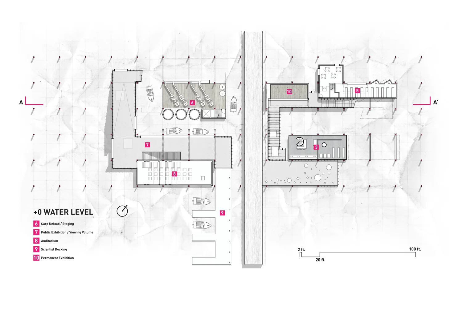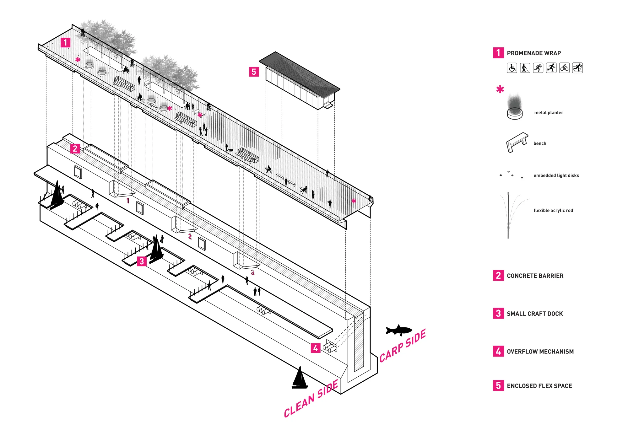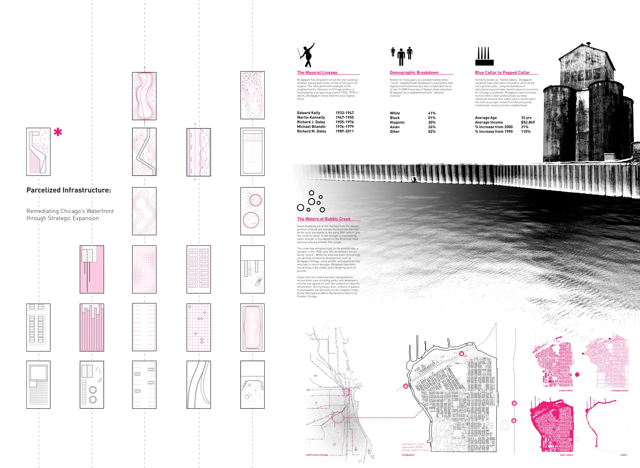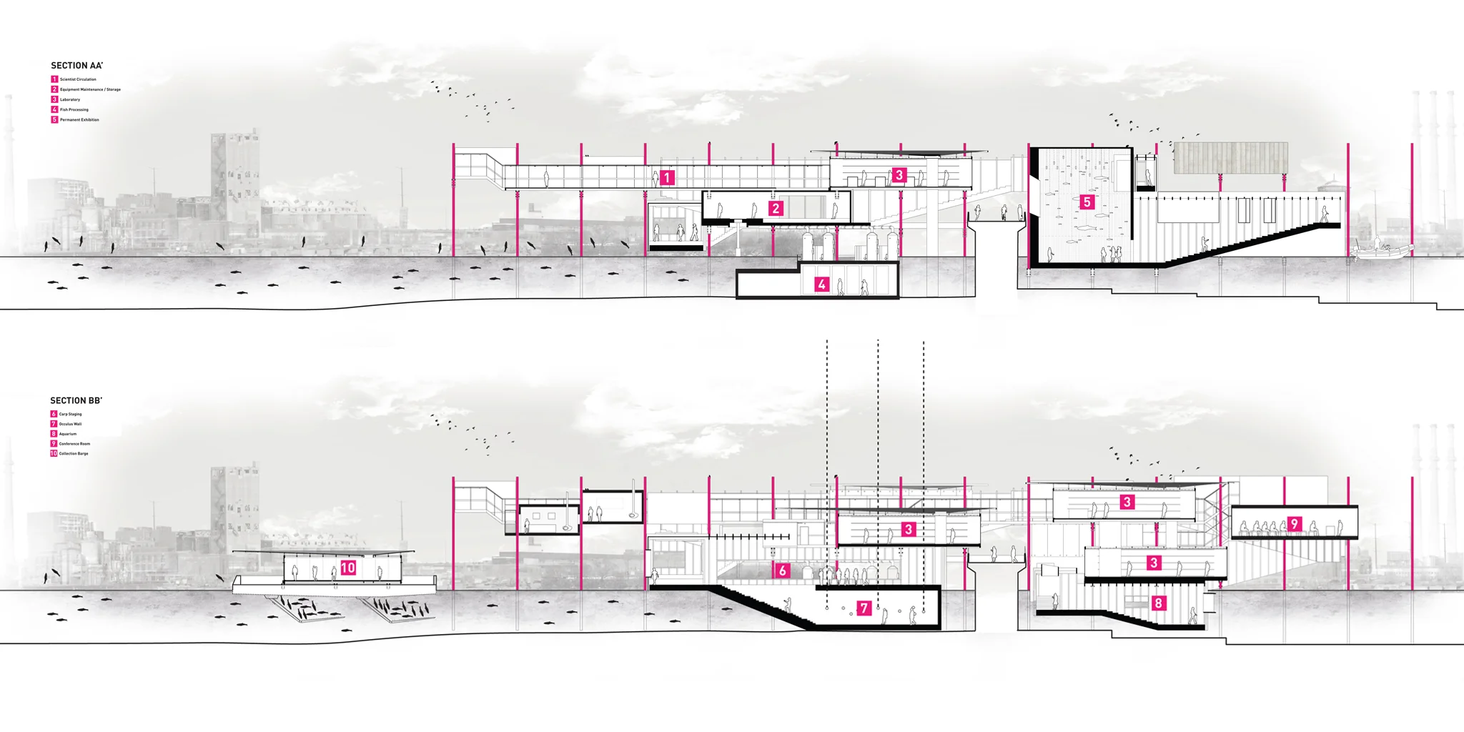 This project attempts to utilize the unsettling characteristics of the Asian Carp as the driver for a new industry in Chicago: a biological resource with Agricultural, Fuel, and Food Implications. A Barrier Wall that stops the Carp from invading the Great Lakes is constructed in the waterway, and doubles as a recreational circuit and spectacular promenade for the surrounding neighborhoods. At its terminus, the Limnology Center acts as a destination and educational tool for the local population to engage with and embrace the new Carp Industry.