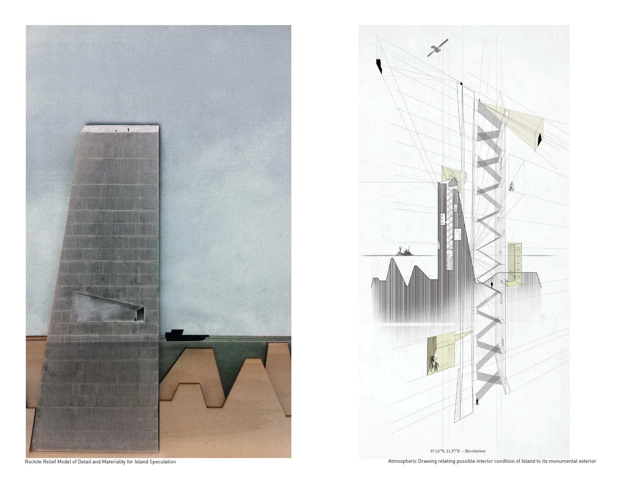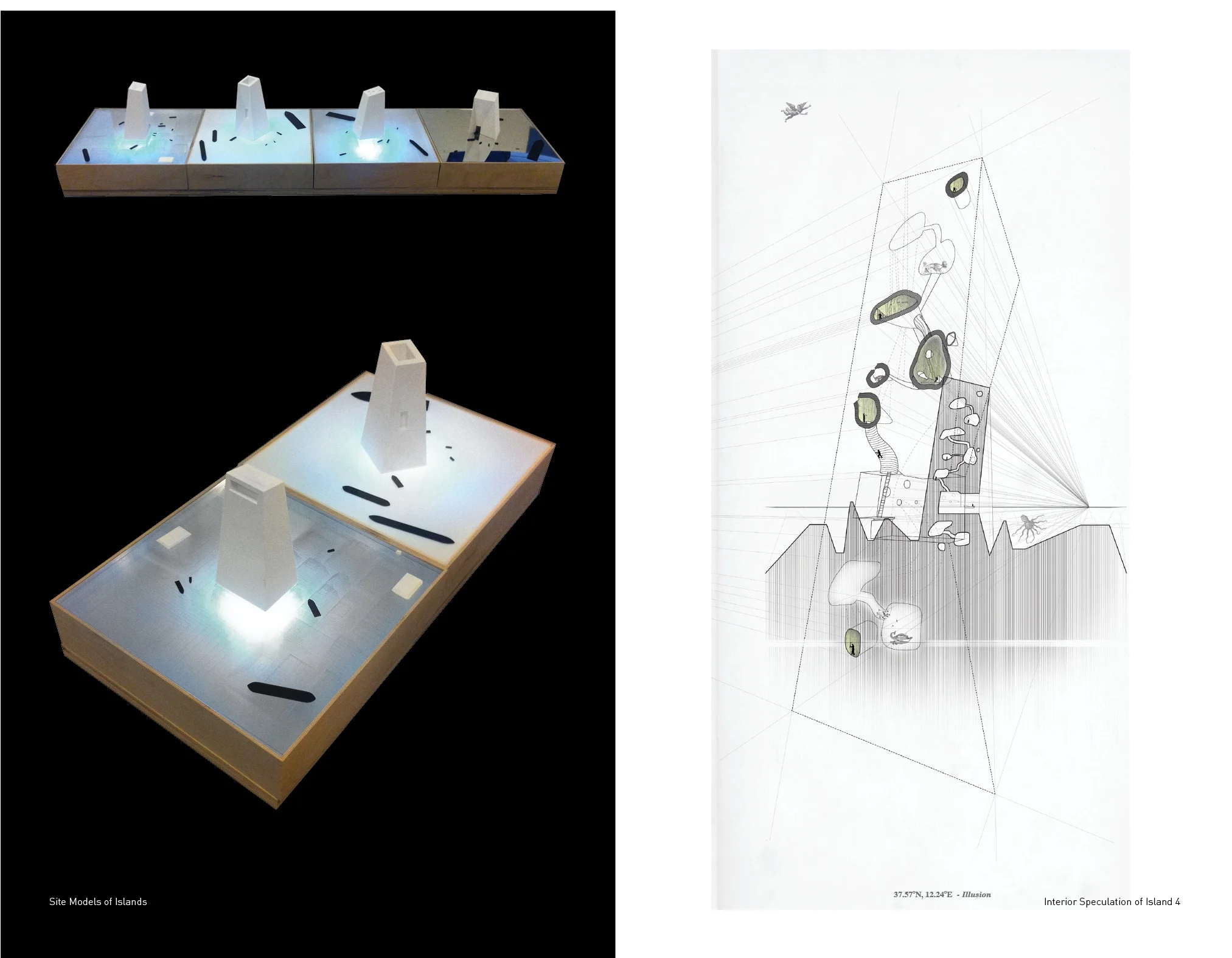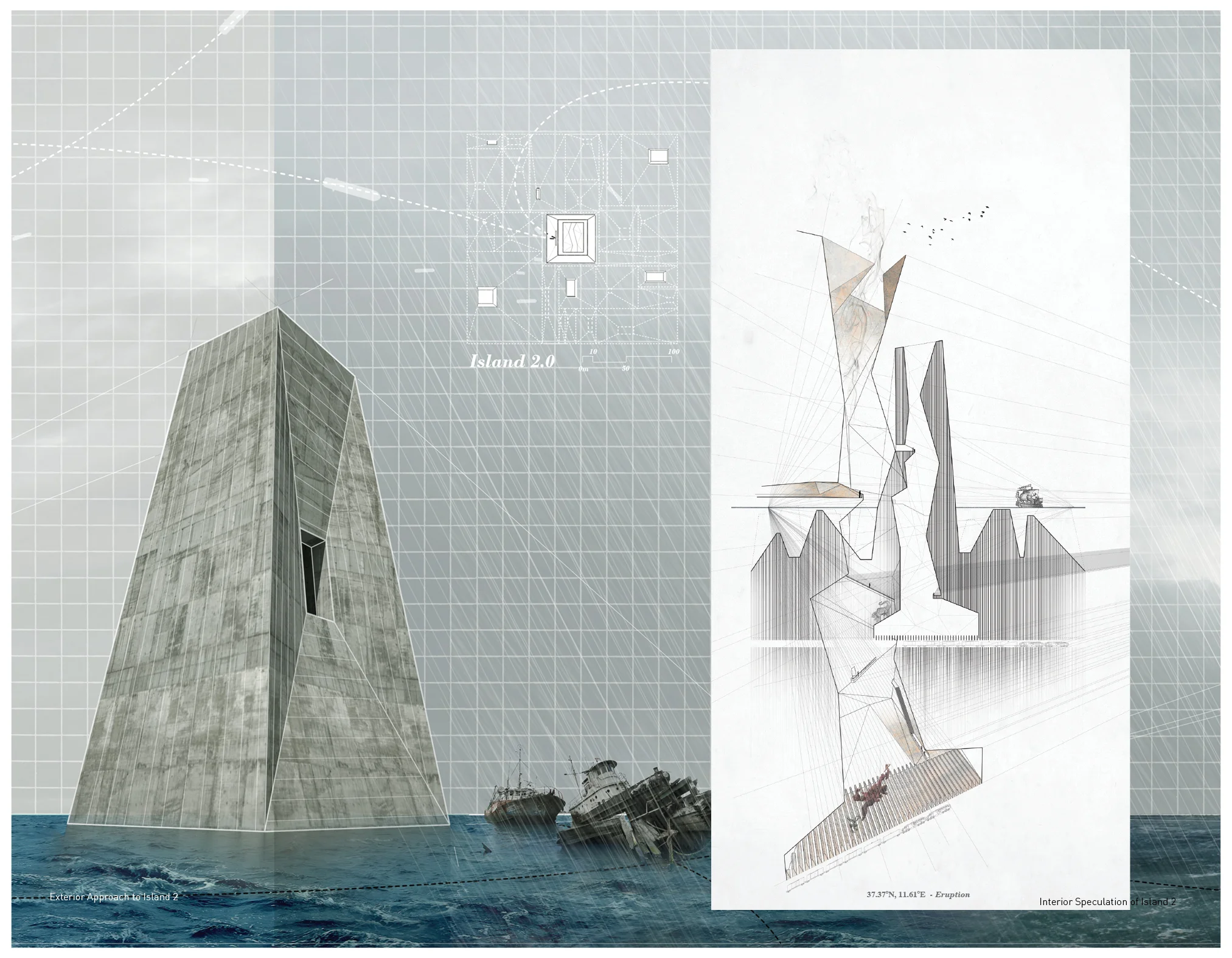 The Strait of Sicily, the divider between the two basins of the Mediterranean Sea, between religions and cultures of the East and West, and between economic disparities of the North and South, becomes the test site for a series of speculations on the form and function of the New Colossus, manifested through the figure of the island in a vast and often scaleless seascape. The new island Colossus is a half land-form, half architectural hybrid that engages in a contemporary debate about the scale of frameworks and contexts through which architecture is designed and thought.